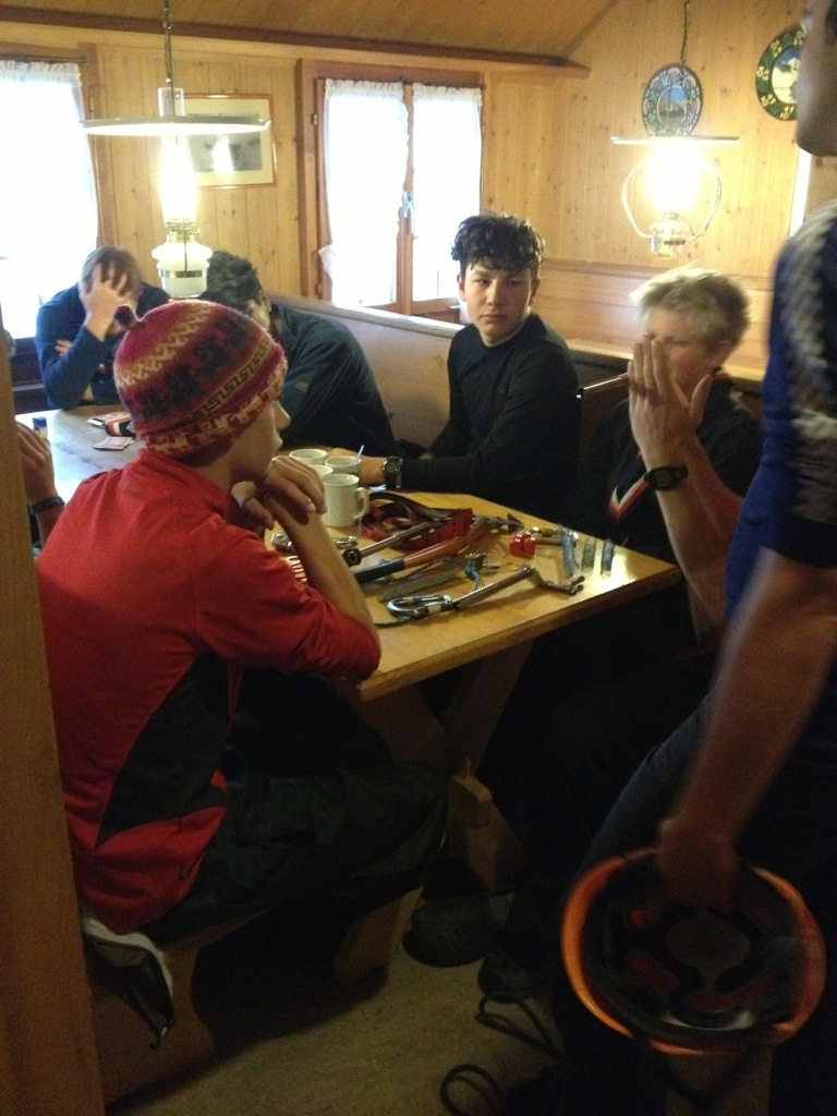 It was a challenging hike, but worth it for the incredible views of the lake and surrounding scenery. We arrived in good time and had a couple of hours of much needed rest, before being treated to industrial quantities of soup, pasta and mountain brew tea! An early night was had by all, and we were woken up at 4am by a storm raging through our open window, which continued for the rest of the next day. It soon became apparent that weather conditions were too poor for us to go out on the ice, which was a big disappointment to all but couldn’t be helped. However, we had a kit talk from the guides, and then practised crevasse rescue techniques (rather exciting!).
