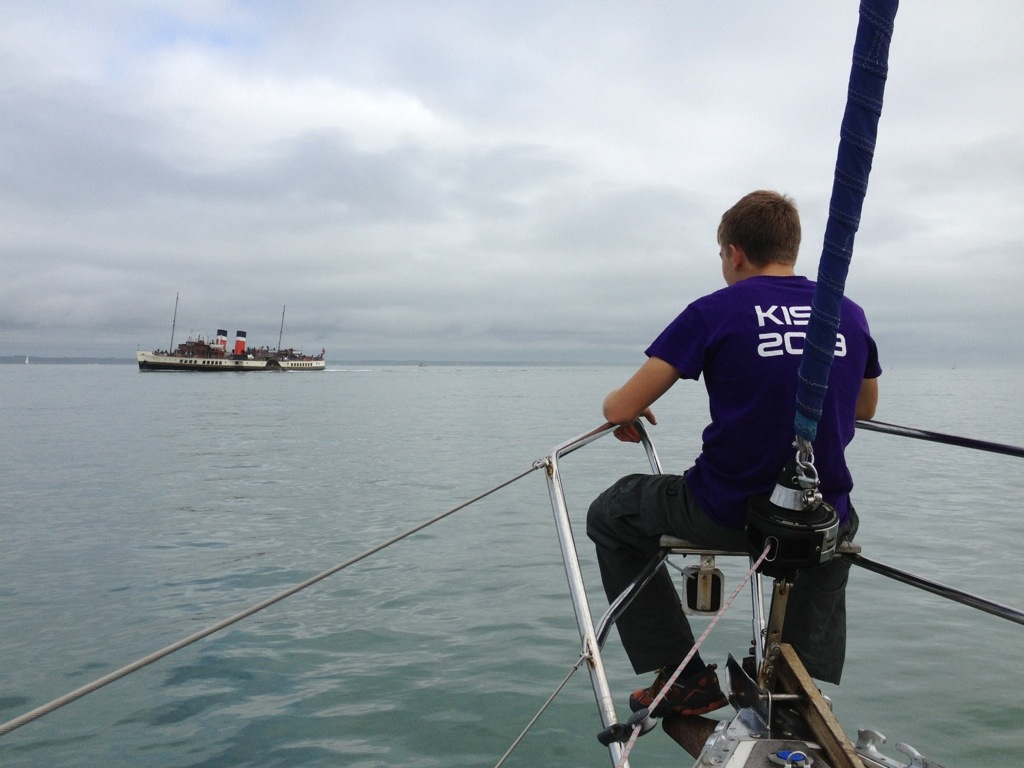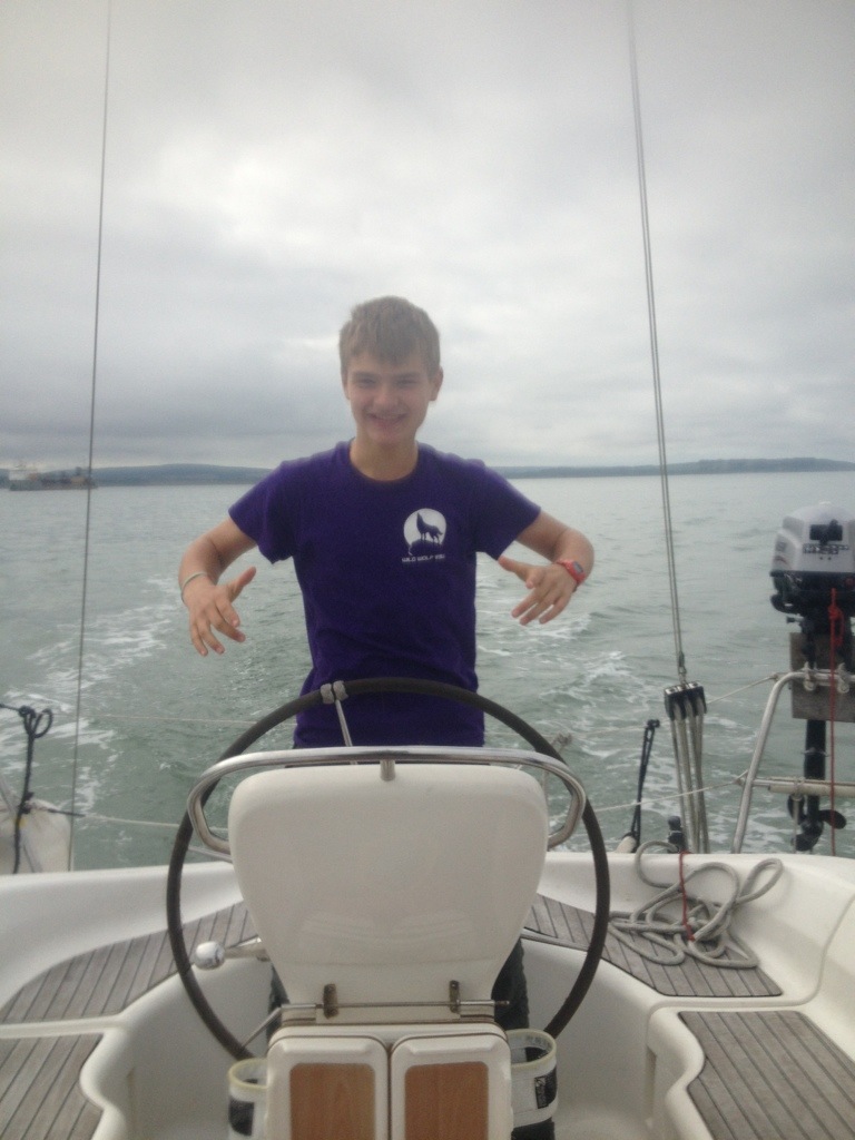 When we got up we made a full English breakfast and went over some knots and what we had to do then we got under way. First we sailed in to Cowes on the Isle of Wight for lunch and had sandwiches. Then we tacked on full sail west towards Yarmouth. The wind was very strong and the boat leaned right over so the handrails were in the water.