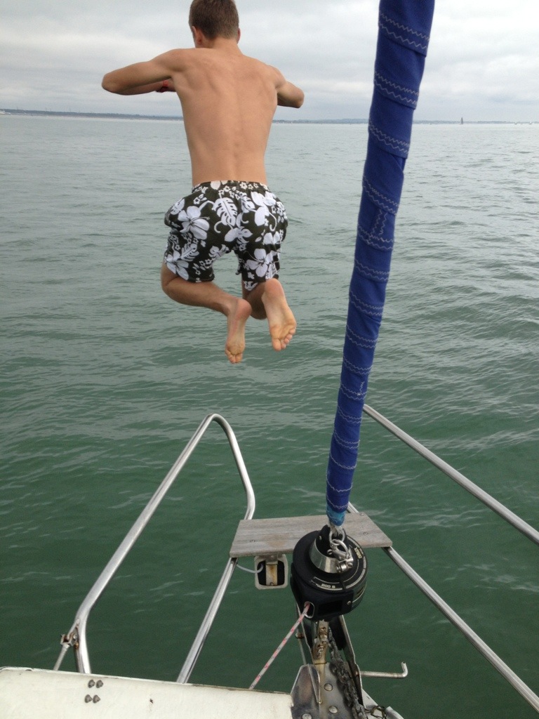 When we got up we took the powerboat to the shore to go to the loo and brush our teeth then we went and had breakfast. We had to move another yacht that had moored next to us so we could leave. There was no wind on Sunday so we motored back to port. On the way we explored Newtown Creek where there is a large Scout campsite. Further on we stopped half way where we dropped the anchor and dived off the boat. Marlon and Theo swam underneath the boat.