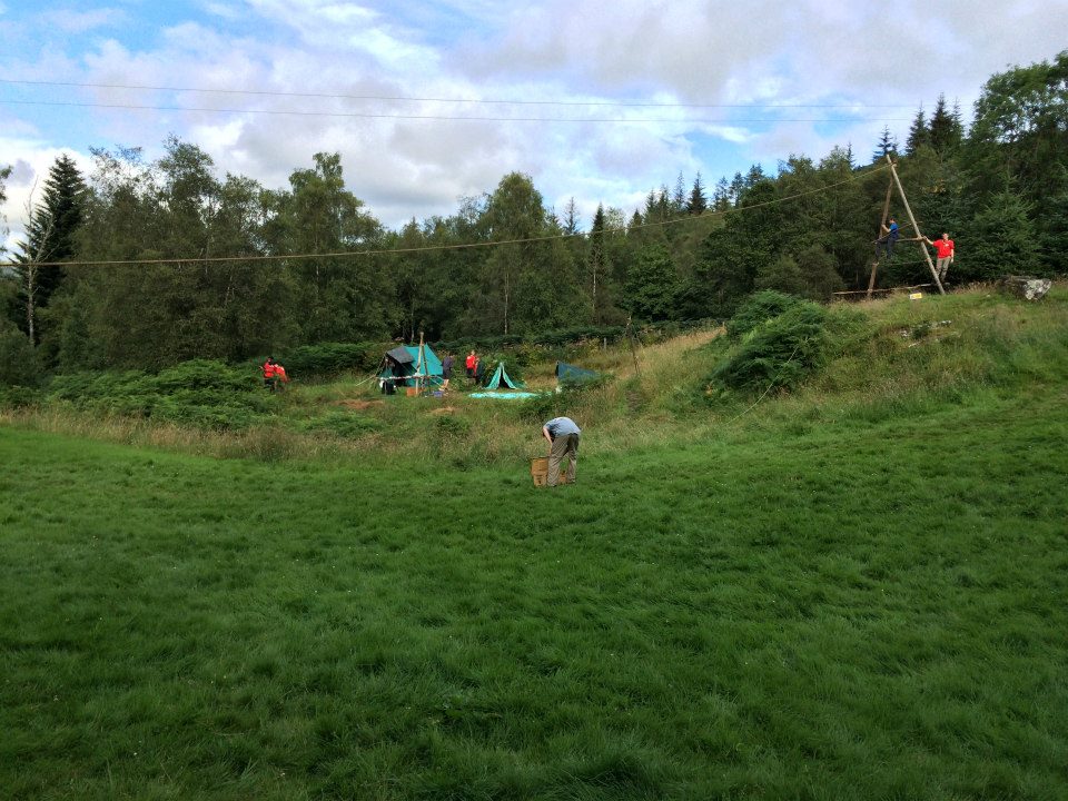 Two days later we all left for Scotland. Myself and Marc left on Friday morning and had a very enjoyable train journey to Dunblane, and then cycled to the campsite. Michel and the minibus arrived and we broke our backs unloading it, and eventually collapsed into bed. The next morning we set off for Tesco in Michel’s minibus to collect a £1,000 click and collect order (the less said about the grumpy check-out staff who managed to mess it up and had to re-scan every item the better) and then headed to the 1st Stirlingshire Scout group to load up the roofrack of the minibus with pioneering poles. Well, we couldn’t have a summer camp without building our camp sofa, could we?! Meanwhile we heard from Annie and Rachel that they were all safely on the train and steaming north, enviously sharing their carriage with a prusecco –drinking party off to the races in York.