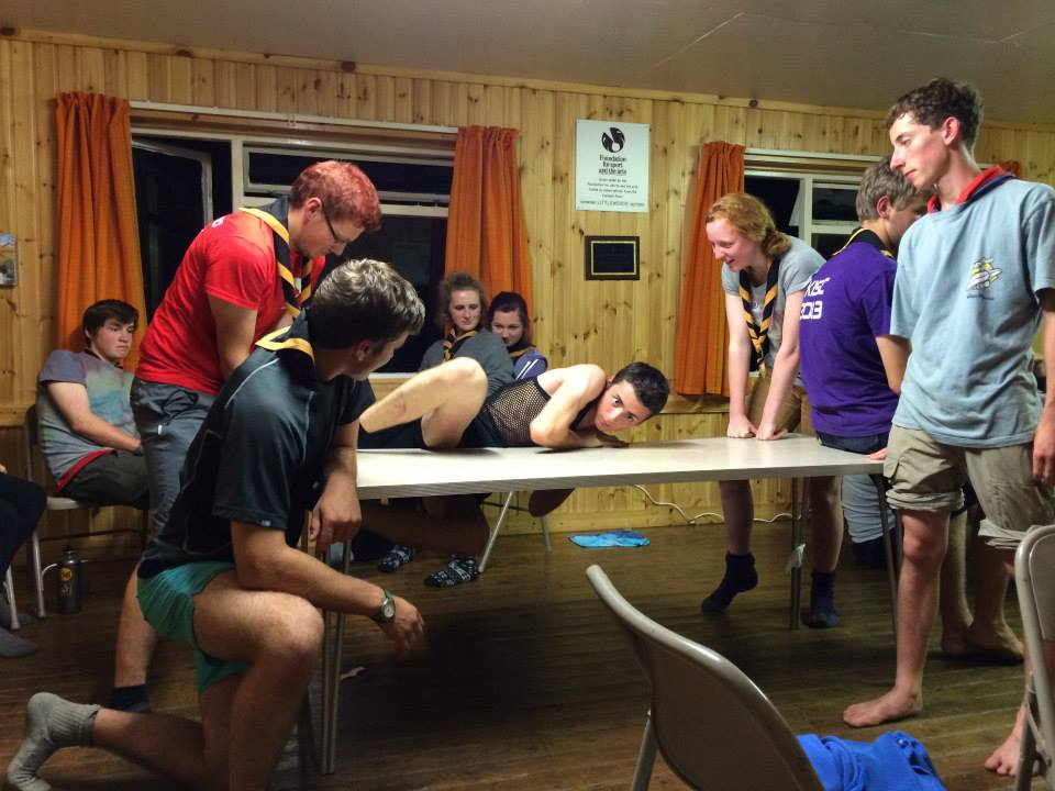 Photo showing table-wresting (one of the Unit’s favourite recurring challenges) and Xander’s string vest (not a favourite in any way).