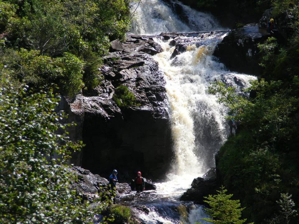 Lunch was eaten by us and we were eaten by midges. We hid in the minibus and eventually we were let into the building to pull on sticky wetsuits, helmets, climbing harnesses and buoyancy aids. A steep walk and a safety talk later and we were at the top of the canyon looking at a waterfall which would surely make short work of something as fragile as the human body!