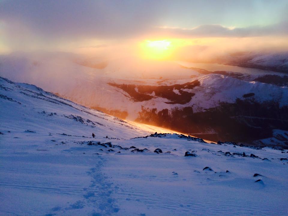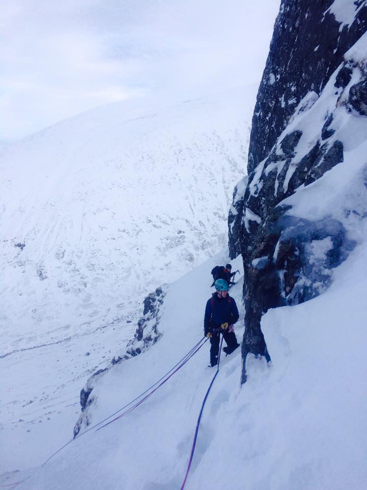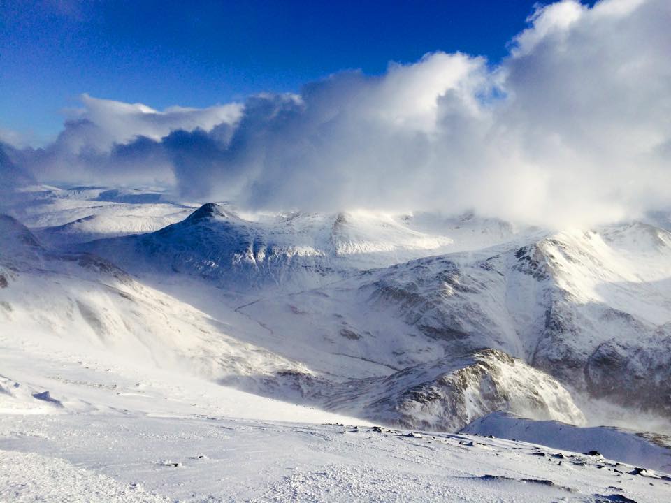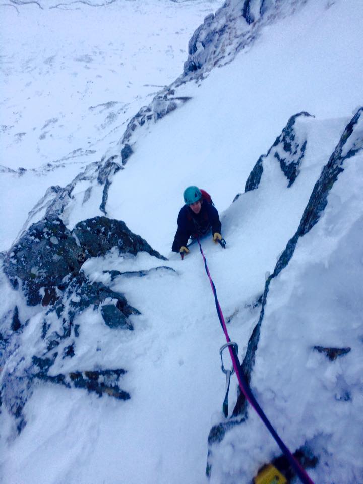 Day one dawned dark, cloudy and (very) windy and we were sure that it was going to be a complete write-off. Nevertheless we geared up and headed out, battling against the wind and navigating over broken ground and arriving at the CIC hut at lunchtime. After a quick sandwich hastily grabbed in some shelter from the wind we strapped on crampons and roped up, and basically walked up an easy grade I gully to reach the top of the Carn Mor Dearg Arete. From there we battled the wind, cut steps, front pointed and laboriously made our way up to the summit of Ben Nevis, getting there just as the clouds cleared, leaving us with this fantastic view to enjoy.