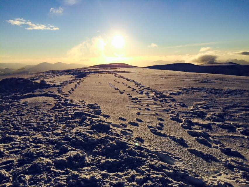 Our route took us nearly all the way to the CIC hut, then across and up the steep neve (frozen snow) slopes onto Carn Beag Dearg, reaching an altitude of 1010m. From there the route was obvious – a three kilometer knife-edge ridge led all the way to the summit of ‘The Ben’. We tied ourselves together using a single rope and set off, picking our way along the ridge, sometimes walking, sometimes scrambling, sometimes handrailing the top and using our crampons on the slope below.