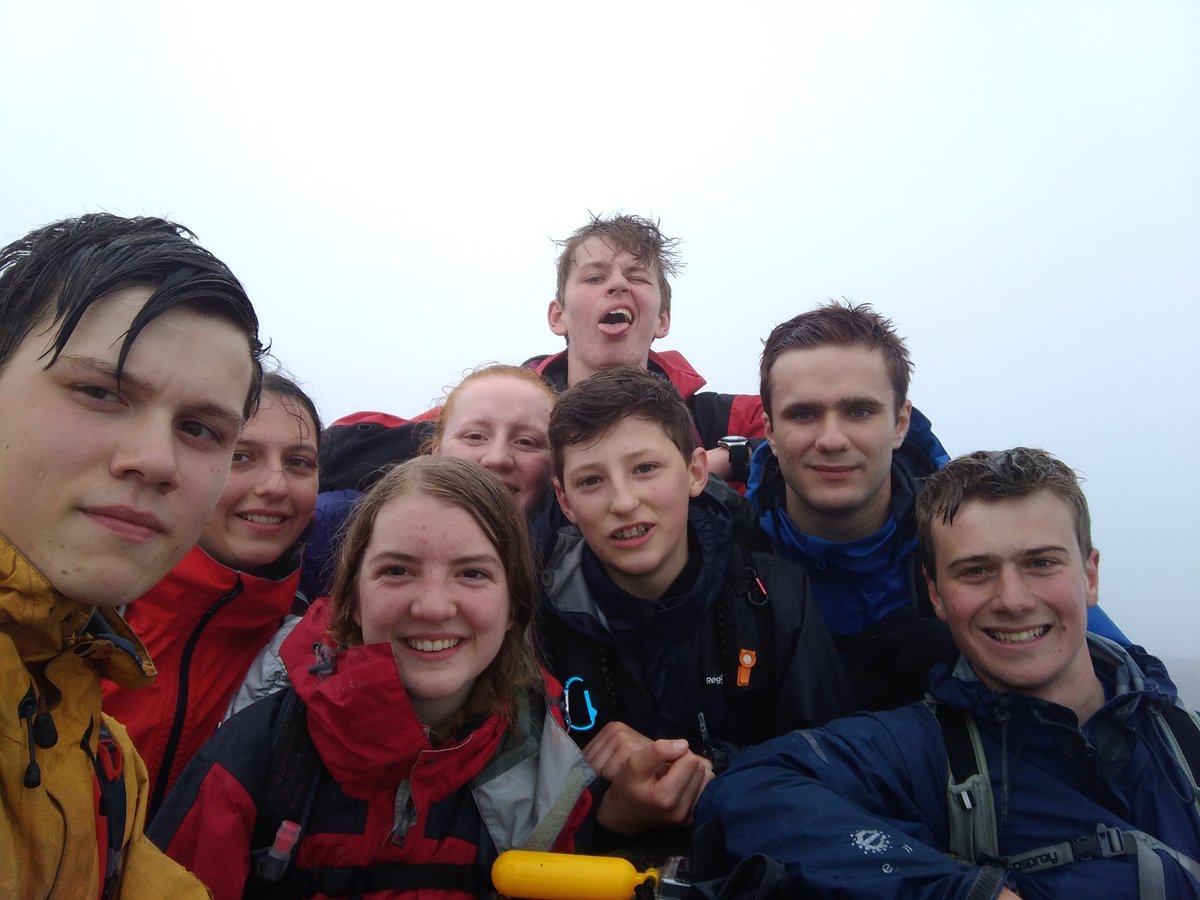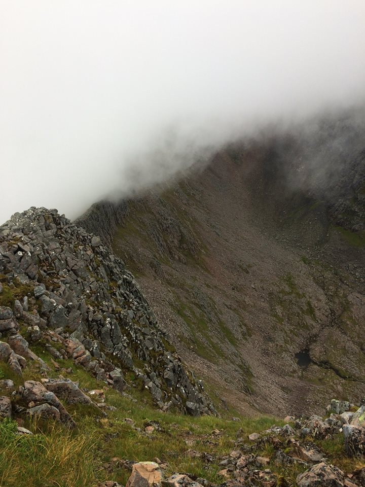Once further up the path, we were again presented with another decision: to take the easier but less interesting route, or the more challenging Carn Mor Dearg arête. The arête was soon found to provide a more stimulating hike for all involved, and therefore we headed in the opposite direction to the route taken by pretty much everyone else on the mountain, making our way to the CIC hut. The majority of the altitude was gained by clambering up a 45 degree slope to reach a height of approximately 1100m. This brought us up to the ridge, where the rapidly shifting mist allowed us brief views of the valley from which we had just come. Eventually we reached the end of the arête, leaving us with only another steep clamber up to the summit. Thanks to Leader Tom’s excellent navigation, we soon reached our goal, and stopped for a well-deserved snack.