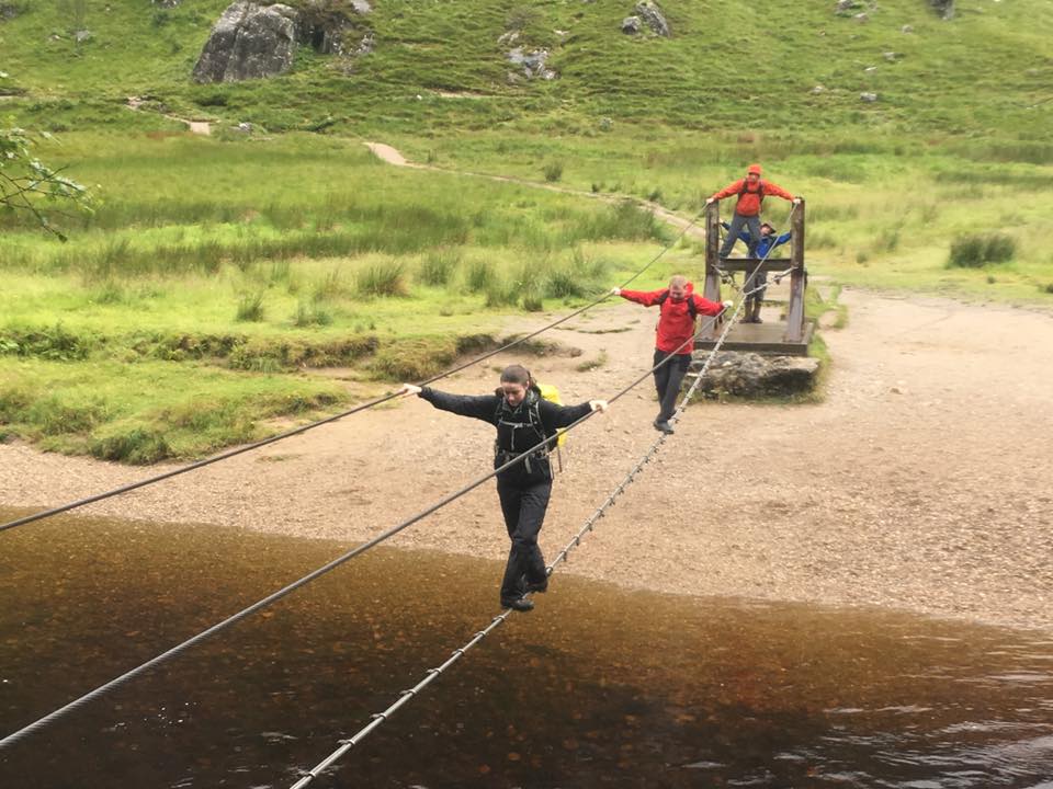 While that determined group gathered their efforts for the trek up Ben Nevis, the rest of us sought a more chilled rest day and decided on a short walk up the Glen Nevis valley to Steall Falls, the second largest waterfall in Scotland. After a short stop for lunch where we enjoyed the staggering view of the 120m falls, it began to rain and we decided to risk getting a little wetter by crossing the river to take a closer look at the base of the falls. To cross the water, we took the Steall bridge, consisting of a single wire for your feet as well as two supports to hold onto as you walk. Once we had all precariously crossed the river we followed the mud that we assumed was some kind of path – wading at times and occasionally losing shoes – until we reached the base of the falls. Water crashed violently around us, the struggle to stay dry having been abandoned a long time ago.