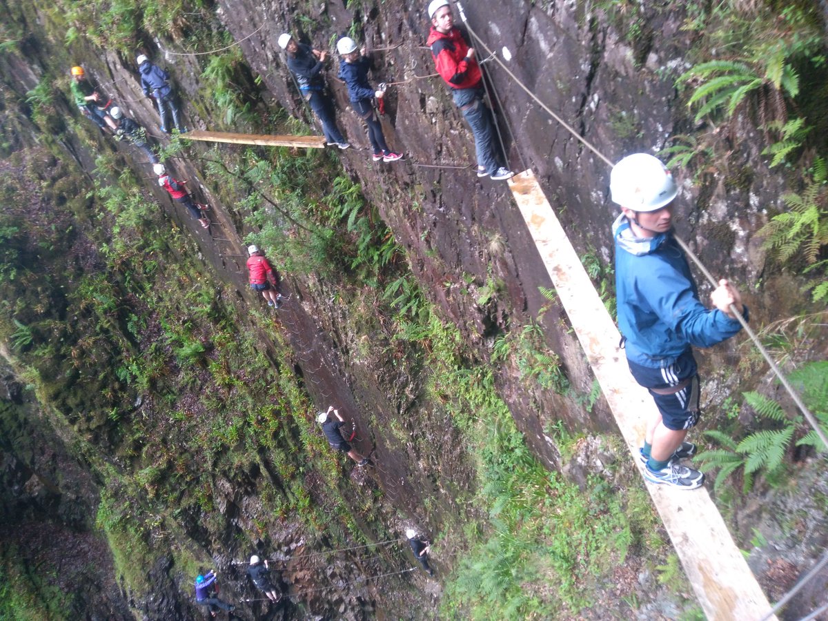 We hurried back to get changed and shovel down some lunch before hopping into minibuses and driving to the via ferrata which was also run by Vertical Descents. Via ferratas – ‘iron road’ for those of you that don’t speak Latin – are climbing routes that follow metal rings, staples and bridges driven into a cliff. The via ferrata we climbed was next to a waterfall and went 110 metres up the cliff face, managing to be both terrifying and awe-inspiring.