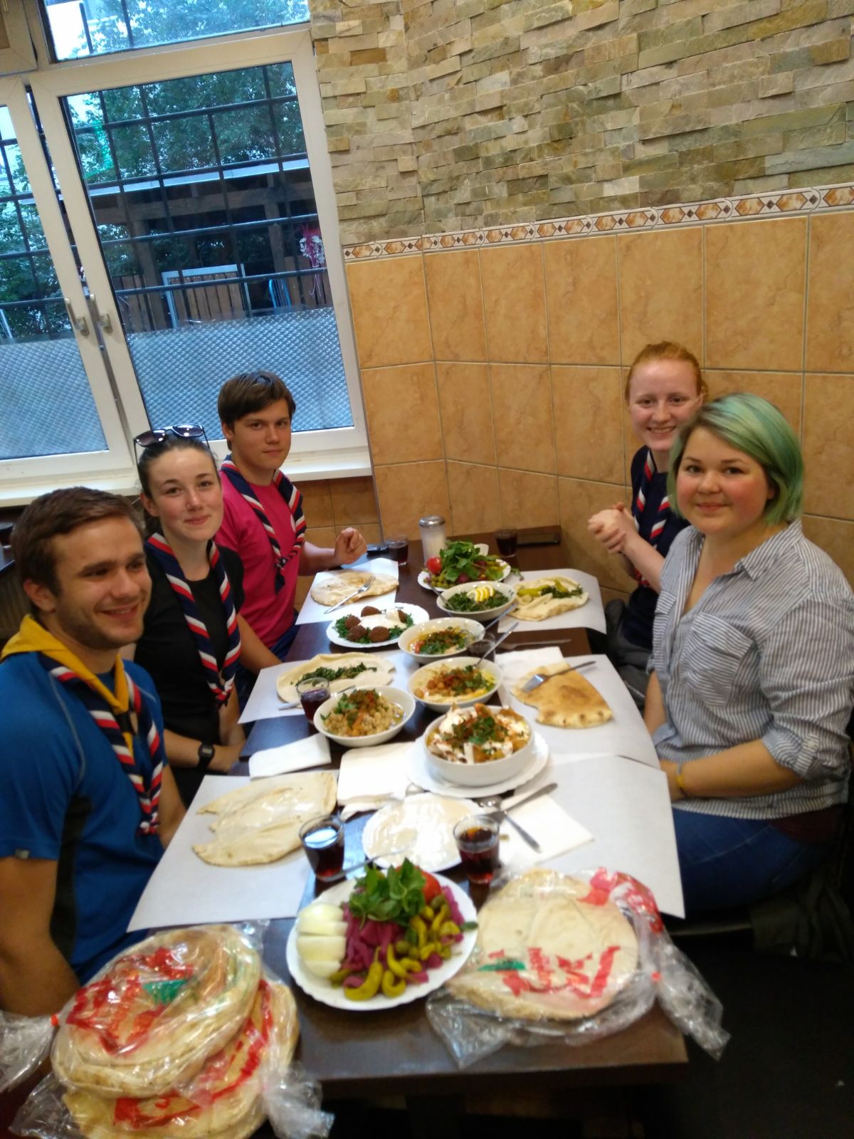 Part way through the day we got a message from a Scout Leader in Kreuzberg offering us a place to stay, so once we’d finished at the Citadel that was where we headed. We soon arrived and Simon, a Scout Leader at VCP Kreuzberg, showed us around the church/community centre/scout hall building that we could stay in for the night. It had a kitchen, showers, sofas, table football and even a few musical instruments as well! But before we could settle down, we were taken on a tour of Kreuzberg. Simon and his fellow leaders, Catherina and Felix, showed us so much of the culture of the area – rather than the typical tourist sights – and we were all amazed by both what they knew and how much they knew. After an extensive tour of the district, we all went to a Turkish restaurant and tucked into some traditional food which included hummus!! The evening was one that none of us will be forgetting anytime soon as we learnt so much about the area and scouting in Germany as well as meeting some amazing people.