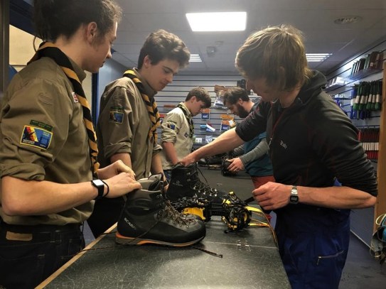 On Sunday we got the train to Aviemore and arrived at Glenmore Lodge, just in time for dinner in the bar. We also caused a minor traffic jam in the Lodge store, as 12 Scouts attempted to book out all the kit we would need for the next day. After heading back to our rooms clutching various assorted equipment (shovels, winter boots, Goretex jackets, avalanche probes, ice axes, crampons, helmets… you get the idea), we went to bed in preparation for the much-anticipated first day of our course.