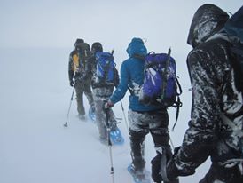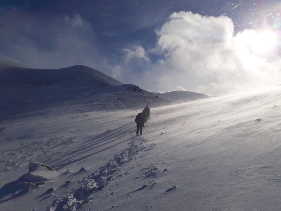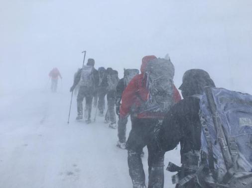 Despite some highly challenging conditions we were determined to get outdoors. We followed the closed road up the hill through deep snow to reach what was imagined to be the car park. Struggling through the winds and snow we couldn’t see more than a few metres ahead. We stuck close together and huddled behind an old ski centre for a quick bite to eat and some shelter from the howling wind.