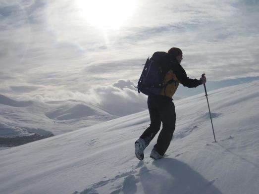 We drove down into Aviemore and parked at the bottom of the “Burma Road” – a 4×4 track into the hills. We followed the track up to about 500m and then strapped on snowshoes and put on goggles. It was most people’s first time in snowshoes and there was a fair bit of falling over at first, although we soon got the hang of it.