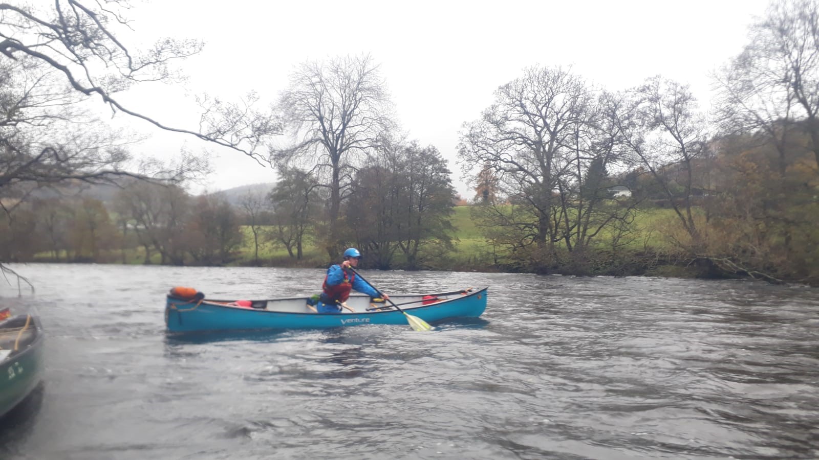 Each group member led a section, demonstrating hazard awareness and group management as we progressed through various rapids. Finally we stopped at the Berwyn rapid to practise some ferry-gliding and the wetter skills of the day: swimming in moving water, throwline use and boat-to-boat rescues. It was at this point that I took an accidental swim – handily demonstrating being able to swim myself and my canoe to the side just before we were asked to.