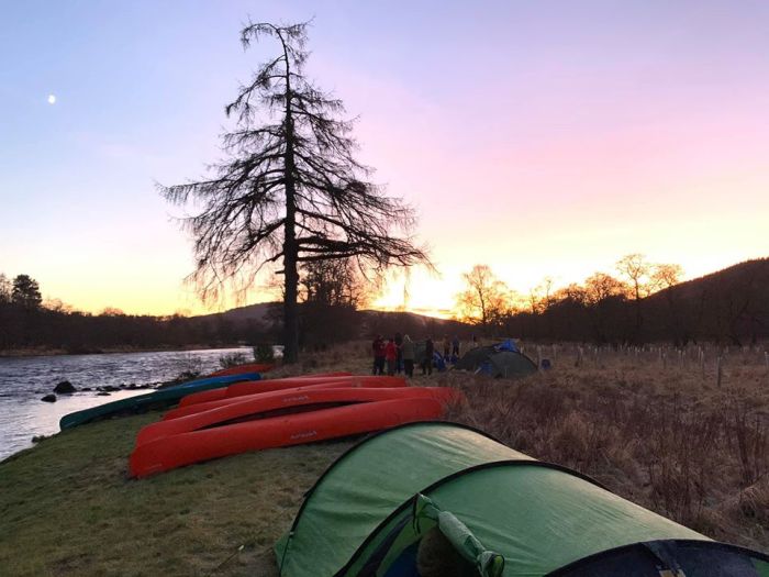 We finished this practice journey on the River Oich in the pouring rain at Fort Augustus, and although everyone was feeling daunted at the prospect of five more days of canoeing and wild camping in the inclement weather, moods improved when we left the wetness of Western Scotland behind and set up camp on the banks of the Spey’s upper reaches in the Cairngorms.