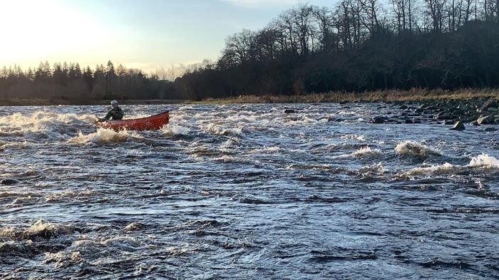 The next morning we packed up everything we had and began our expedition. The River Spey is unusual in that it speeds up as it gets closer to the sea due to the land generally steepening right until the coast, so although some members of the group were disappointed that it started slow it was set to pick up. Indeed, as we set up the tents after our first day grumblings were heard around camp about the lack of serious white water and the slog through the reed beds into Loch Insh. Things couldn’t be more different on following days, however, because we picked up speed as soon as we left Loch Insh behind. The river levels were on the high side which gave us a fantastic ride and opportunities to get bored were very limited. Everyone enjoyed negotiating the rapids and bouncing down the wave trains. We were brought back down to earth one day when we saw an unfortunate sheep drowned in the river, caught by its horns in some branches, which was a morbid reminder of the danger of the ever-present strainers on the river banks.