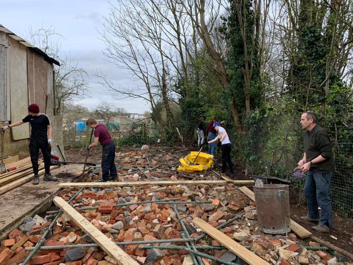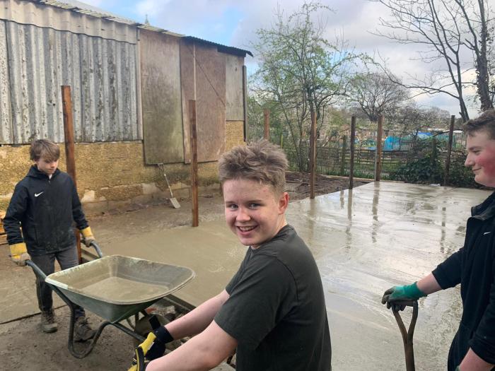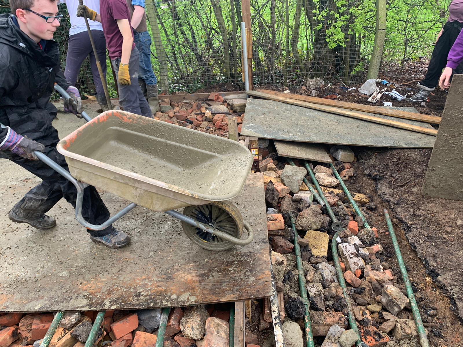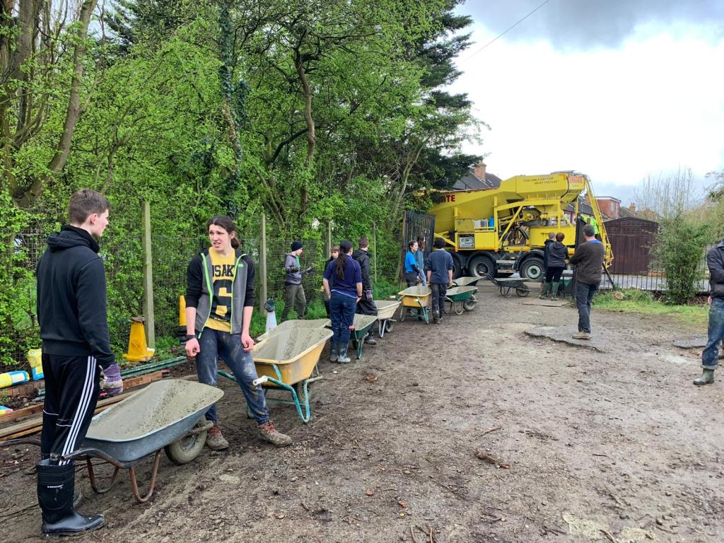 We were pretty disappointed when the driver of the lorry told us that he wouldnโt be able to drive over the kerb and into the yard – and that we would have to wheelbarrow the concrete all the way by hand. However, lots of Explorers were soon arriving with wheelbarrows and it suddenly seemed much more manageable.