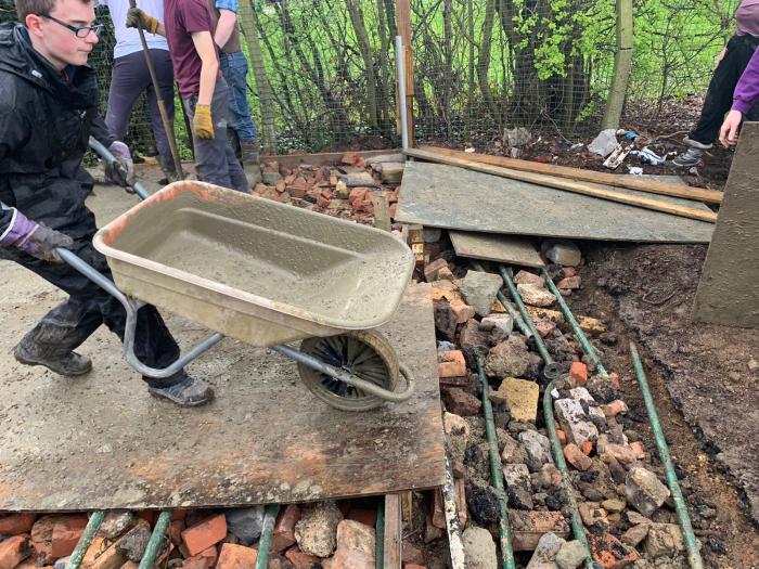 At bang on 8am the lorry started pumping out concrete and while mums and dads made bacon rolls and offered โhelpful adviceโ to everyone that was wheelbarrowing concrete from the lorry to the mould, a team of Explorers was busy wading making sure it was going to set completely flat and level between the sides we had made the weekend before.