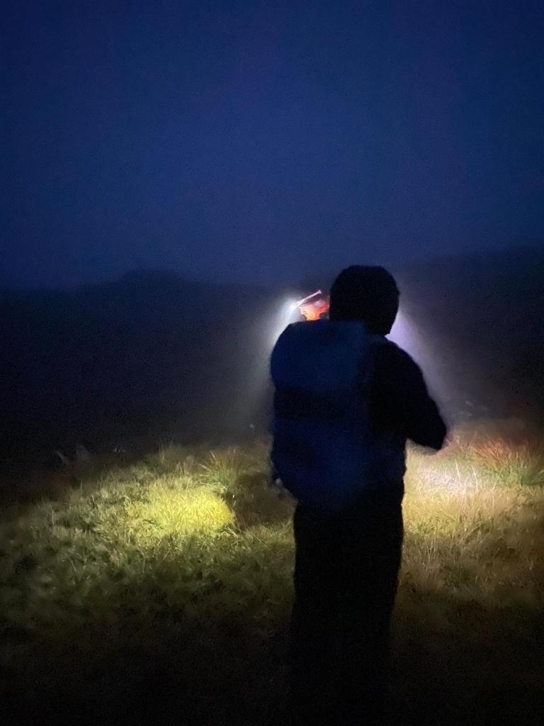 After a relaxed dinner, John took us out for night navigation. This is done to mimic getting off the hill in either extremely low visibility, or at night if something has gone wrong during the day. I was surprised at how little you can see at night, even when the hills are claggy, you realise how much of a difference even 50m of visibility can make. When your view is restricted to the small bubble of light coming from your headtorch, it’s much harder to work out where you are and very easy to miss obvious features even when they’re very close by. For me, this was a stark reminder of how easily it is to get lost if you’re caught out by the conditions and emphasises the need for regular practice of these skills in a safe environment. Following this, we headed back to camp for a brief discussion of how the night-nav had gone. Then we headed back into our tents and went to bed.”