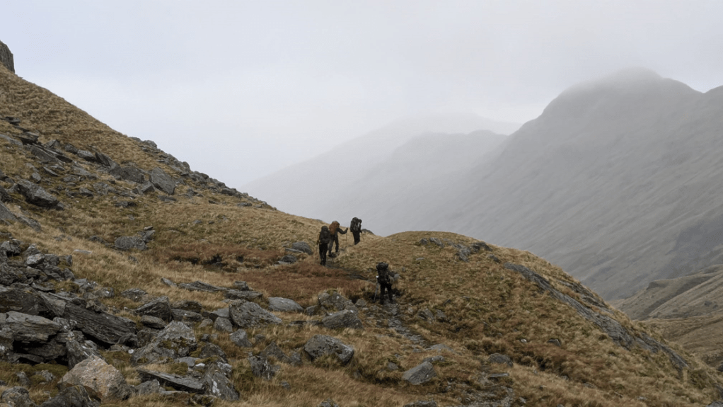 After our wonderful walk through the forest, we entered Bealach an Lagin Duibh (or what John likes to call it, and a much more fitting name ,THE GATES OF DOOM). Which looks quite nice at first, until you venture deeper and it becomes a boggy, squishy, squelchy mess of constant ups and downs. After around 2 hours and travelling about 2.5 kilometers we stopped for a quick bite at a river where we met Nigel’s group and discussed how horrible the terrain was. After 5 mins Nigel left our little lunch spot along group to continue with their long, slow adventure (which we would follow 10 mins later) with the good news that Sourlies bothy, our main stop, was only 1km away and then all we had to do was climb halfway up a 946 meter tall Munro, it being 3:30 PM we figured that we had loads of time to do all that.