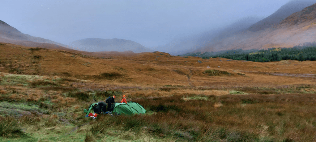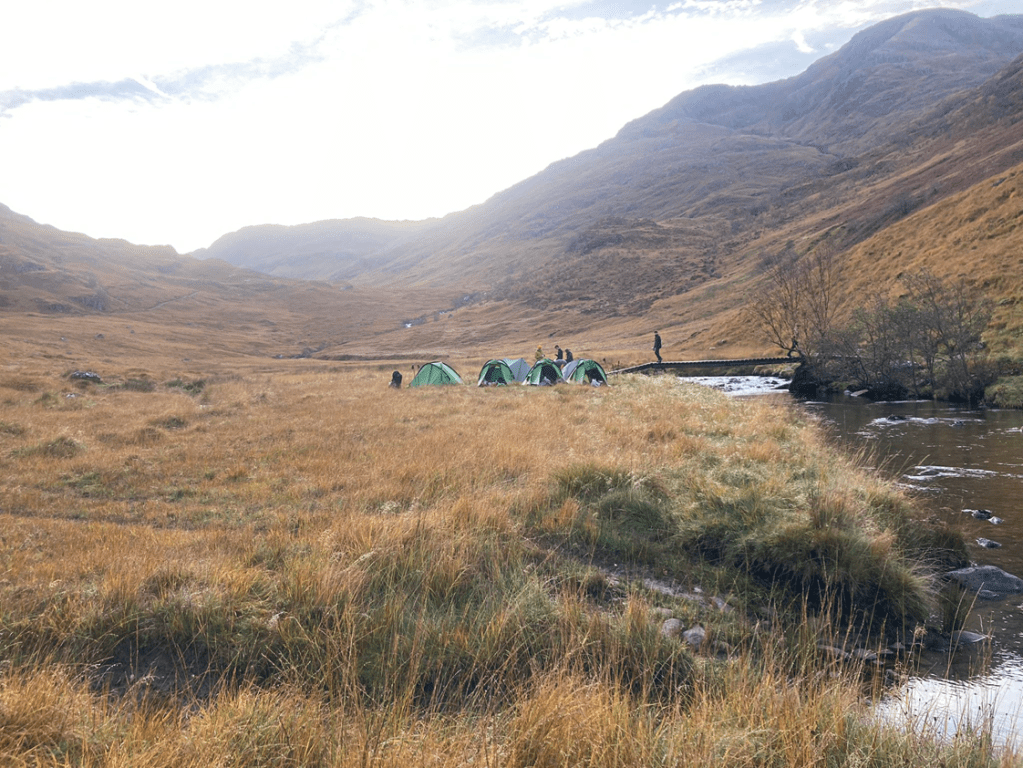When crossing the border Scottish tunes blasted throughout to get us in the mood for the glens, bothies and Munros to come. We had a quick stop at Morrisons in Fort William to stock up with food for the expedition ahead, then the short journey back through Glen Coe to the campsite, passing many iconic sights such as the famous Three Sisters. We put up our tents and sat down and had fajitas for dinner. Later on, we packed our expedition bags with food, clothes and waterproofs and bedded down for the night to get some much-needed rest for the journey ahead.